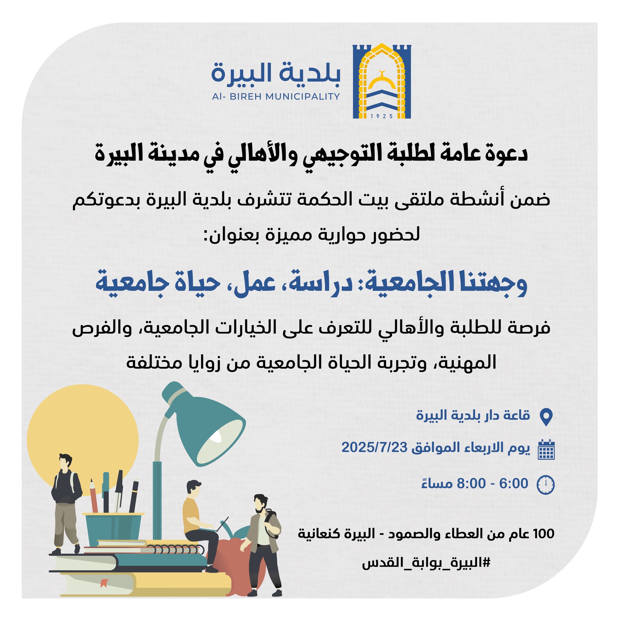 تذكير لطلبتنا الأعزاء لا تفوّتوا فرصة المشاركة في الحوارية الطلابية “وجهتنا الجامعية” مساحة حوار وتبادل خبرات لمساعدتكم في اختيار التخصص والمسار الأنسب لمستقبلكم الأكاديمي #١٠٠_عام_من_العطاء_والصمود #البيرة_كنعانية #1925_2025